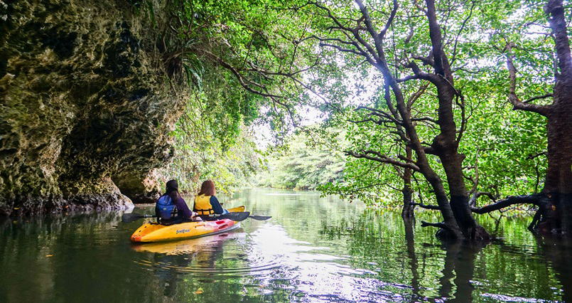 変化に富んだマングローブの生い茂る川や広大な海へカヌーを浮かべて自然を体いっぱい感じ