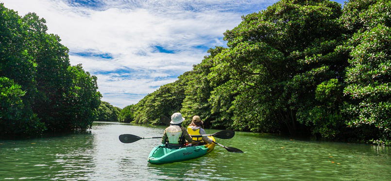 変化に富んだマングローブの生い茂る川や広大な海へカヌーを浮かべて自然を体いっぱい感じ